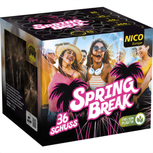 36 Schuss, vielseitige Effektstern-Batterie mit 6 unterschiedlichen Effekten und 4 gefächerten Feuerwerksrohr-Reihen, endend in einem Finale mit 6 gleichzeitig aufsteigenden Bombetten mit roten und grünen Farbstern-Buketts, umrahmt von unzähligen silbernen Knattersternen.
