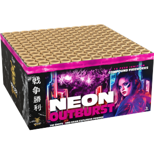 144 Schuss Neon Outburst Compound mit großen Cracklingwolken kombiniert mit Neonfarben und weißem Glitter. In continuierlicher Schussfolge bleibt der Abendhimmel ständig gefüllt. Wunderschön!