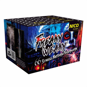 66 Schuss, nacheinander zündend. Rot, grün, gelb oder silbern aufsteigende Leuchtkometen unterbrochen von breiten weißen Glitzer-Buketts, Knatterstern-Regen oder Crackling-Pfeifen.