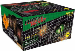 Verbundfeuerwerk mit 4 Batterien und 144 Schuss; Bunte Effektaufstiege mit extremer Zerlegung zu drehenden Chrysanthemen-, Leuchtstern-, Trauerweiden-, Glitzerregen- oder knisternden Palmenblüten-Buketts, endend in einem schnell geschossenen Finale