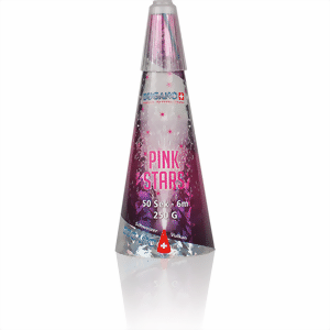 Unser hochwertiger Premium-Vulkan stammt aus Schweizer Qualitäts-Fertigung und begeistert mit großen pink-farbenen Sternen im Silber-Titan-Regen
